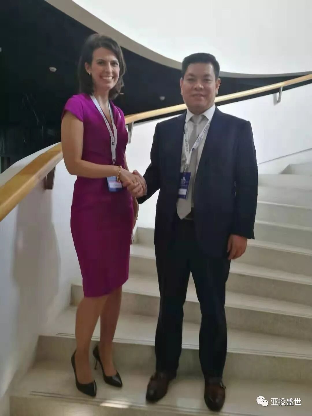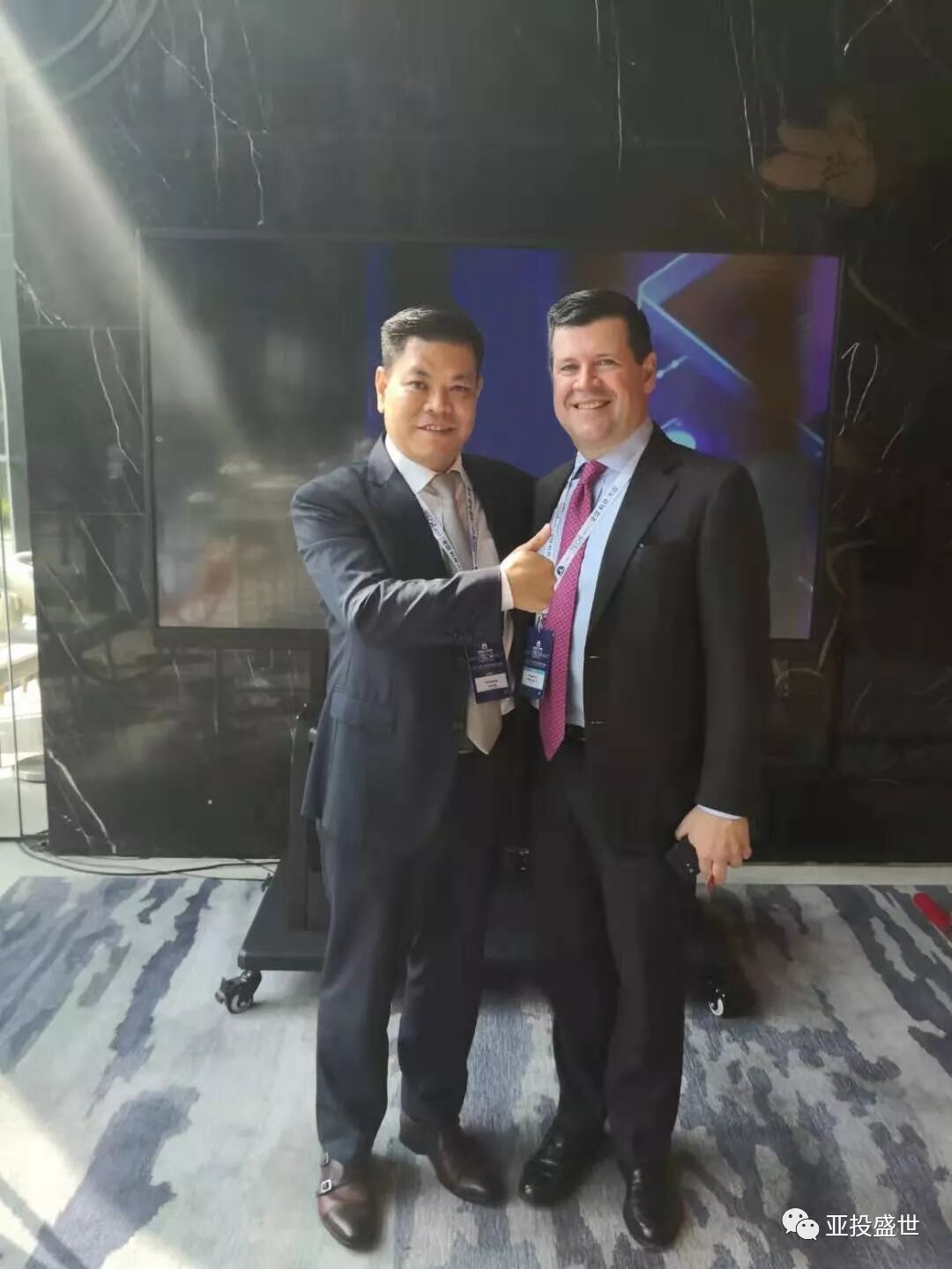 2019年11月19日,亚投盛世集团总裁黄彪鹏先生、总裁助理林铭先生等出席“East Tech West, 2019CNBC全球科技大会”时,与纳斯达克高级副总裁、亚太区主席麦柯奕(Robert H.MCCOOEY,JR.)进行了友好交流,并对亚投盛世给予高度赞赏!